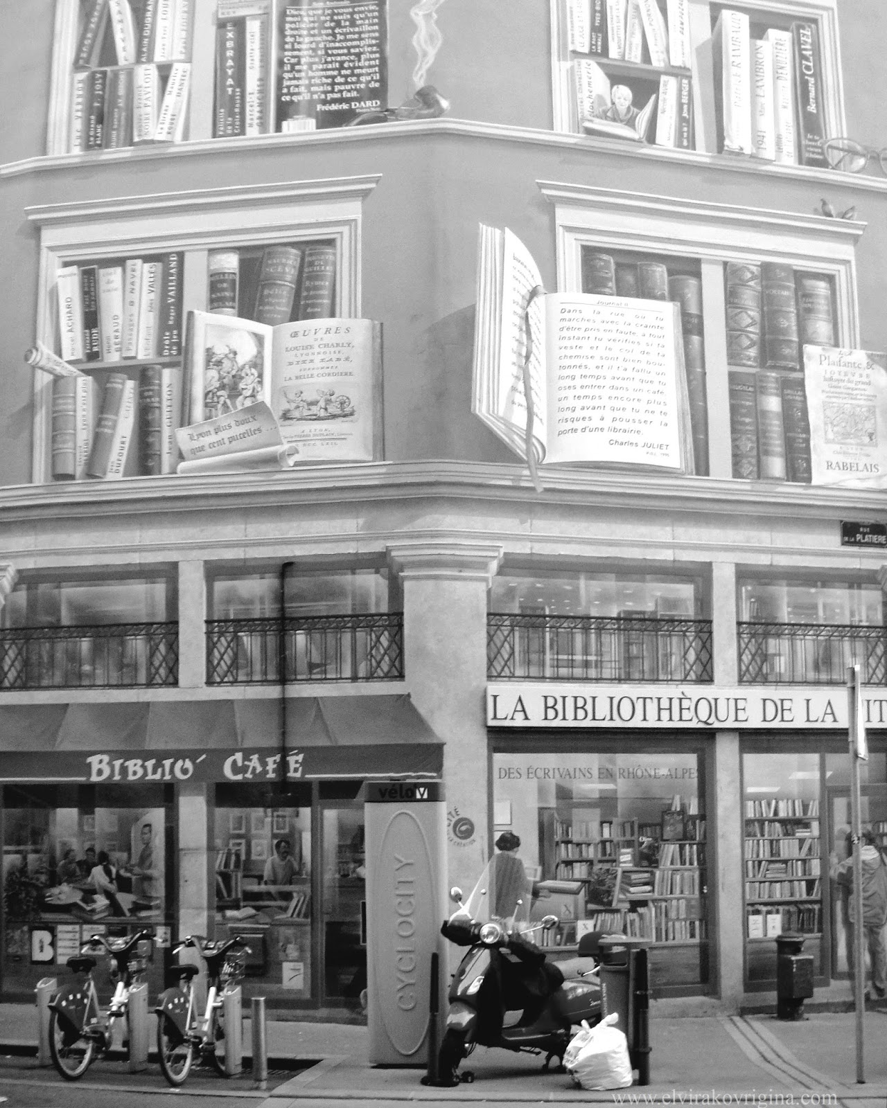 А вот ещё одна на углу rue de la Platière и quai de la Pêcherie: «Фреска писателей» («Fresque des Ecrivains»). Или «La bibliotheque de la cite» (опять не смогли остановиться на одном названии) :) Художник и его дизайн-студия «Cite de la Creation» в 98-м году «расставили» и «разложили» по «полкам» фасада около 300 книг писателей региона Рона-Альпы. Знаете французский? Для вас – выдержки из этих самых книг на этом самом фасаде.